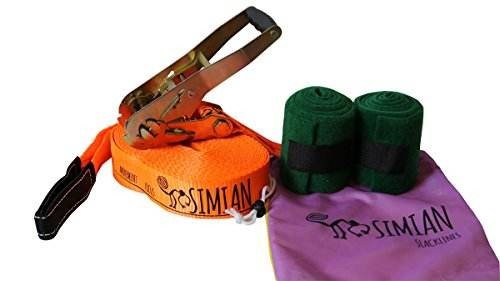The two-section setup consists of: a long (30–100-foot, 9–30-metre) piece of two-or-one-inch (5.1 or 2.5 cm) webbing with a loop sewn on one end, allowing it to cinch tightly around a tree. The second section is typically much shorter (10 ft, 3 m) and has a similar sewn loop on one end, allowing it to cinch around a tree while the other end of this shorter piece of webbing is sewn to a ratchet. The ratchet allows these two sections of webbing to be connected and tensioned to the user's specifications.